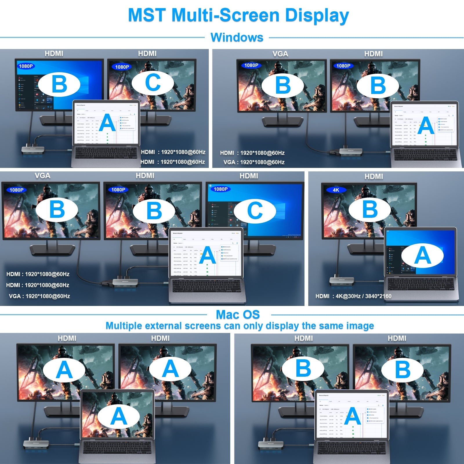 With MST feature support, BENFEI USB Type-C HUB could support up to 3 maximum screen output, 2 HDMI and VGA. The screen could be identical or different depends on your computer setting. The resolutions could be up to 3840 2160@30Hz, 1920x1080@60Hz (1080p Full HD) including 720p, 1600x1200; Please pay attention: the supported resolution is up to the output combination, please refer to the product description.