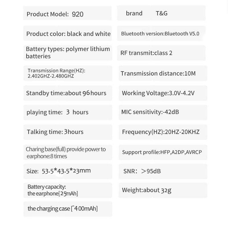 Clear Hi-fi Sound t & g Tg920 Tws Touch Control Wireless Earbud 5.0